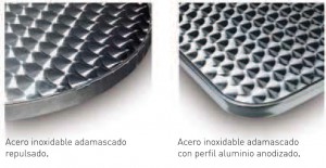 Los tableros INOX adamascados suelen fabricarse pegando una fina chapa de acero inoxidable sobre un tablero aglomerado de madera. En el mercado encontraremos dos variedades: